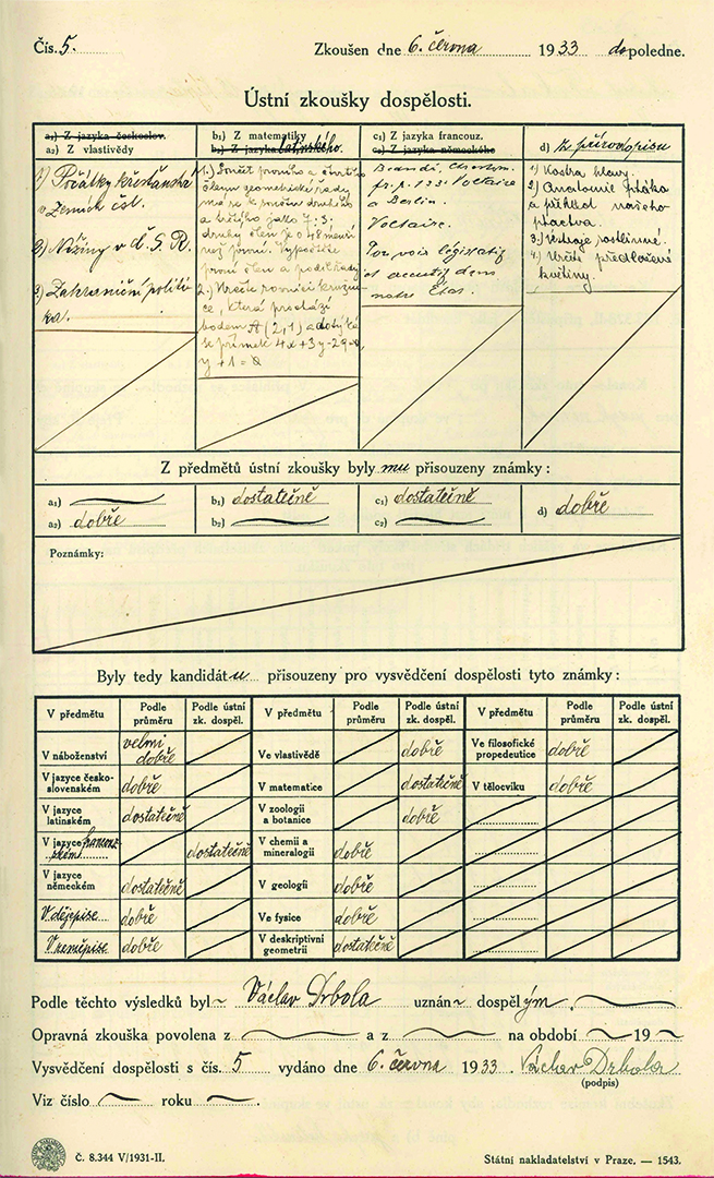 1933 Dne 6. června 1933 vydalo hustopečské gymnázium Václavu Drbolovi „Vysvědčení dospělosti“ s číslem 5.